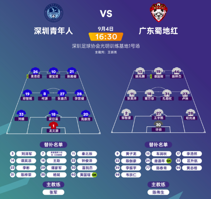受台风天气影响,这场比赛被单独安排在9月4日下午进行。比赛中,两队都尽遣主力出战。深圳青年人主教练张军安排麦思劲担任场上队长,尤文灏司职门将,谢宝贤、李营健、郑智铭、高康浩、梁日富等球员同时登场。秦北辰、谭宾凉、王斯等球员在替补席待命。