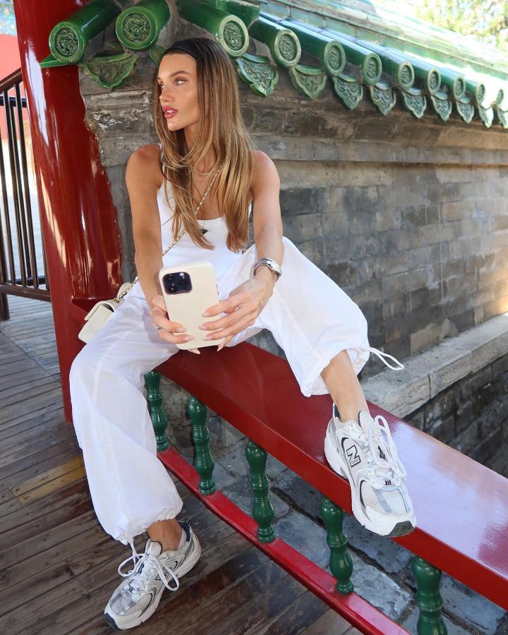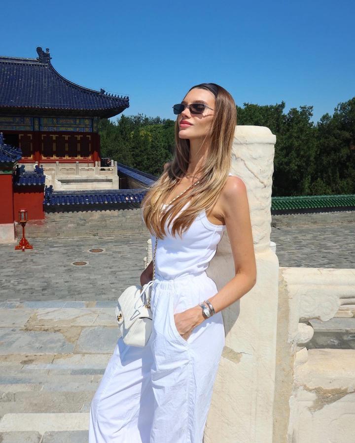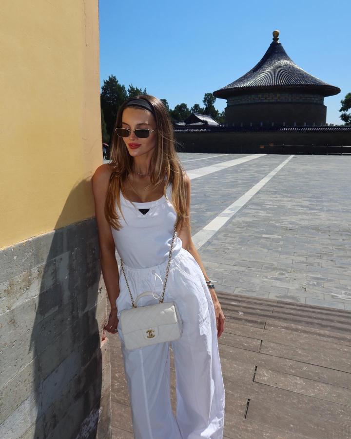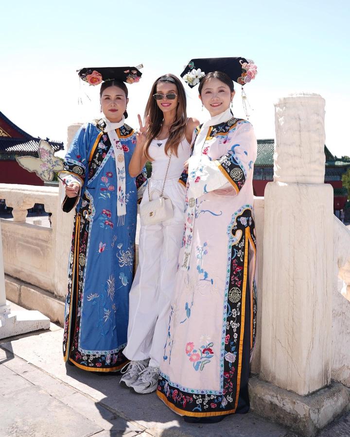 作为时尚博主的比安卡一身纯白搭配来到了天坛,上身的吊带,下身的阔腿收脚裤,简约又大方,在两位身穿传统清朝满族服饰的“格格”身旁,她的时尚撞击感让人恍如隔世。