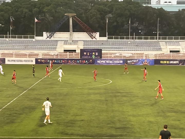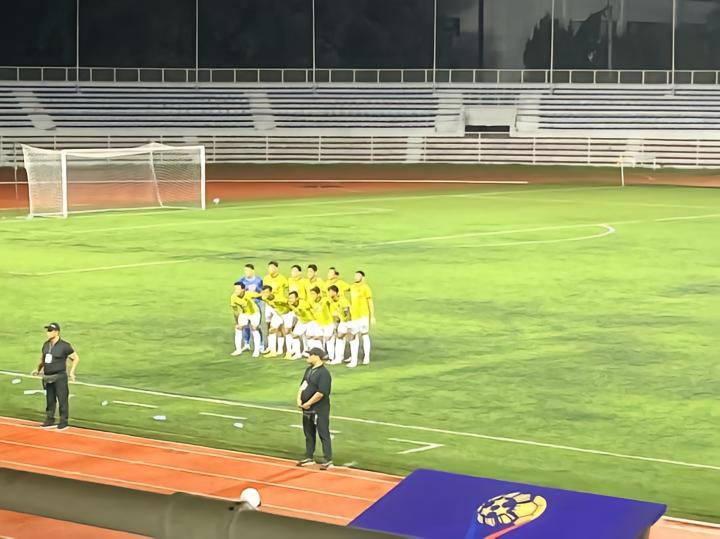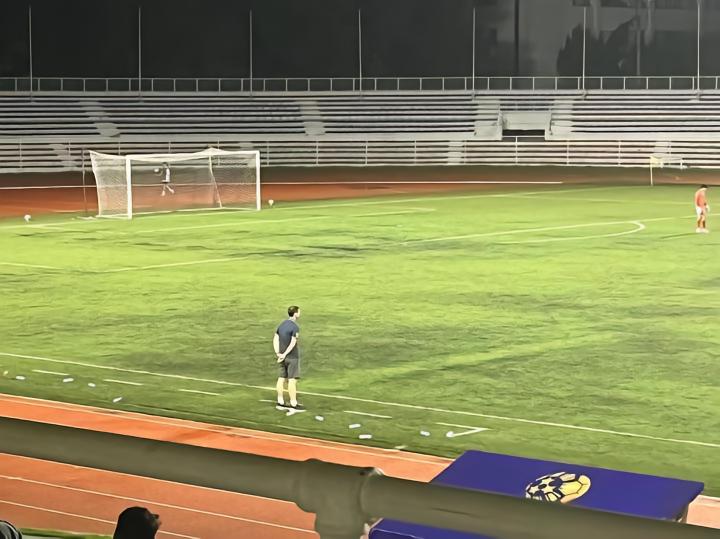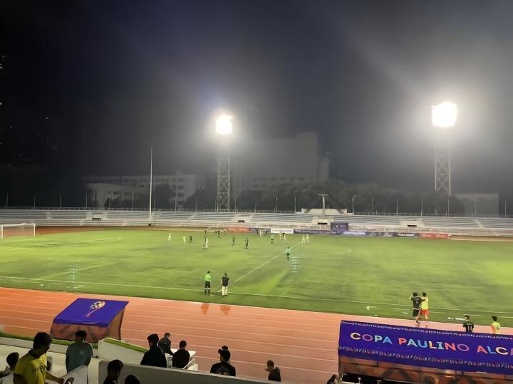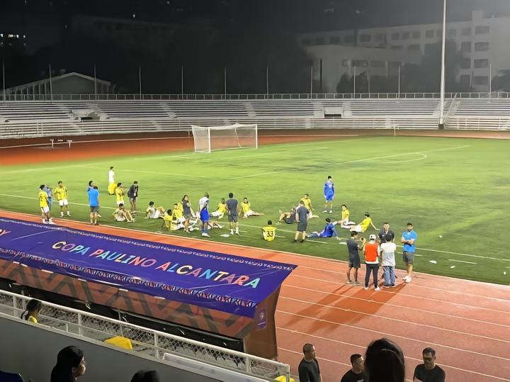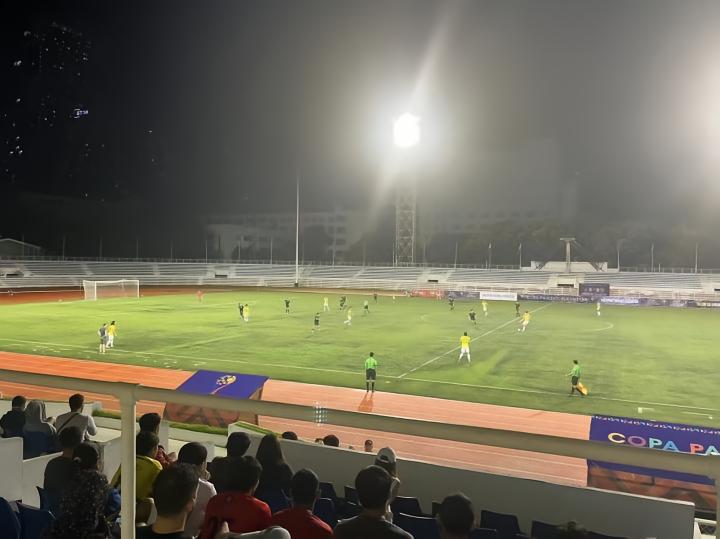 9月3日晚八点在黎刹纪念体育场进行的是菲律宾杯A组卡雅FC与CF马尼拉队之间的比赛,卡雅FC前三轮全胜进27球失1球。而CF马尼拉队是由去年还在参加菲律宾联赛本赛季退赛的ADT队的班底组成,小组赛前四场三胜一平,本场比赛算是本组头名之争。山东泰山俱乐部几位来到马尼拉进行客场赛前考察的工作人员本场也来到现场考察对手。比赛免费入场,也没有安检,有顶棚的这面看台上稀稀拉拉的坐了几百人,大部分是菲律宾足球圈内人士和与球队相关的人员,刚踢完上一场比赛的球员就在看台上一边吃炸鸡一边看比赛。