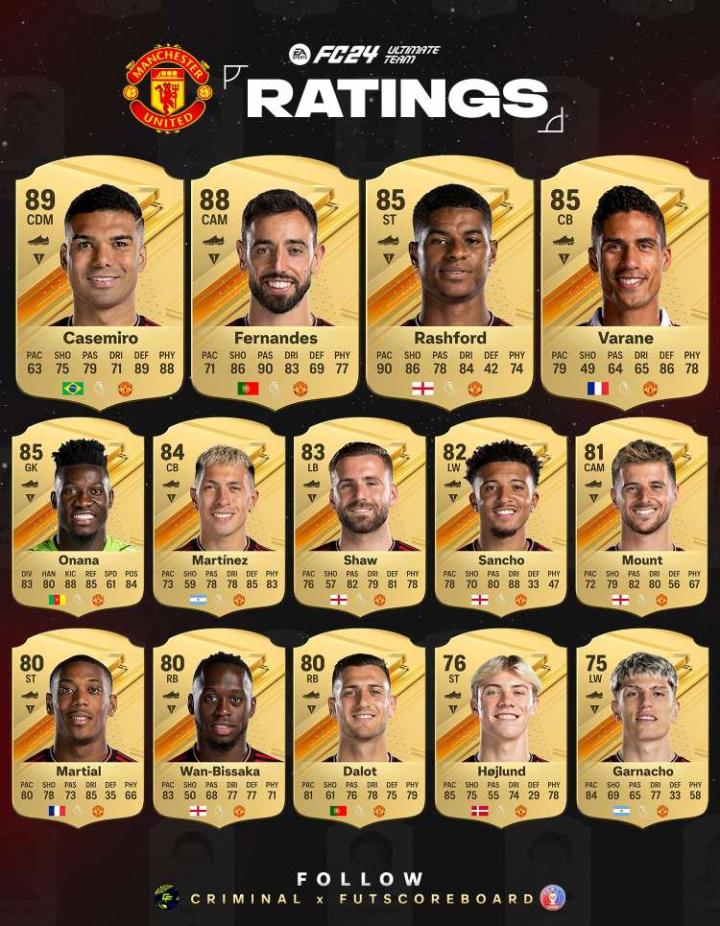 网传EAFC24足球游戏的曼联球员综合评分,卡塞...天天向上Football @懂球帝2023-09-05 20:53网传EAFC24足球游戏的曼联球员综合评分,卡塞米罗89分居首,B费88分排名第二,拉什福德、瓦拉内、奥纳纳85分并列第三,利马、肖、桑乔等等球员在列,你觉得评分是高了还是低了?展开更多