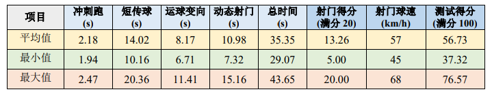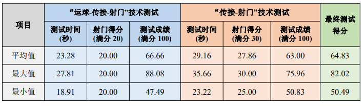 整体上看,参加本次测试的大部分球员具备一定的基本足球技术能力,表现较好球员的技 术能力接近良好水平,表现不佳球员的技术能力需着重提高。由于青少年阶段是发展足球技术 能力的“黄金期”,仍需要通过有效的训练提高基本足球技术能力水平。