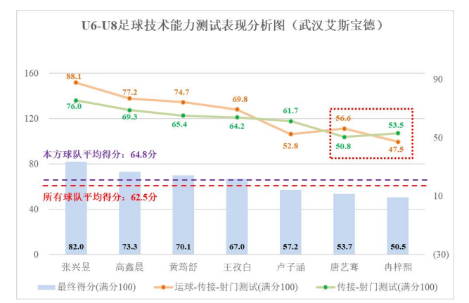 本队共7名球员参加测试,通过对两项测试成绩进行分析,能够对比不同青少年球员的测试表现,以客观量化的形式辅助教练员评价技术能力水平、分析个人技术优缺点、选拔有潜力青少年球员。