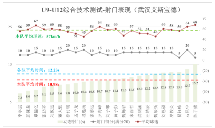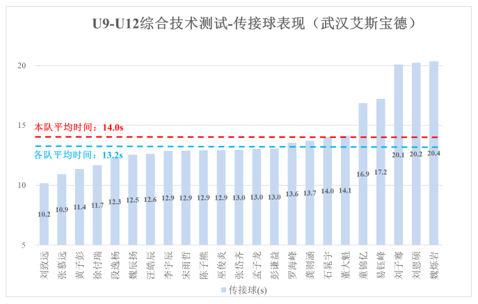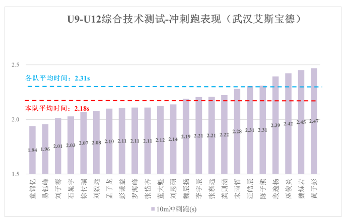 本队共 23 名球员参加测试,通过对各分项测试表现进行分析, 能够对比不同青少年球员的测试表现,以客观量化的形式辅助教练员评价技术能力水平、分析 个人技术优缺点、选拔有潜力青少年球员。