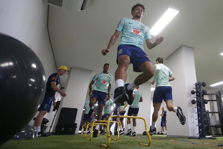 巴西队首先在室内力量房进行了身体激活训练,随后转向场地,30分钟后由开放转封闭,迪尼斯进行了第一次分组对抗训练。三名门将单独进行了扑救、出球训练,未参与分组对抗。