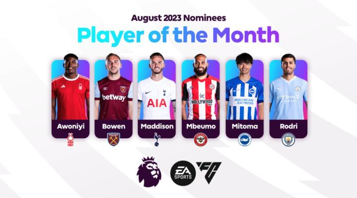 9月7日,英超官方公布了8月最佳球员6人候选名单,罗德里、三笘薰领衔,麦迪逊在列。