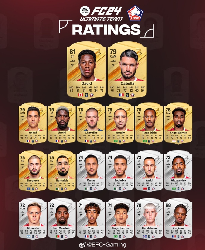 EAFC24关于拉齐奥,加拉塔萨雷,里尔的部分或多数球员评级数值 。