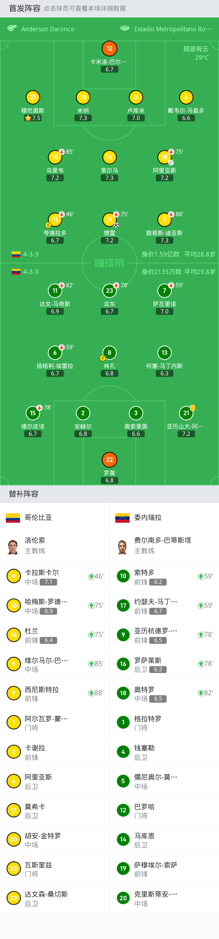 替换下场:46'11-夸德拉多, 85'15-乌里韦, 75'19-博雷, 75'18-阿里亚斯, 88'7-路易斯-迪亚斯