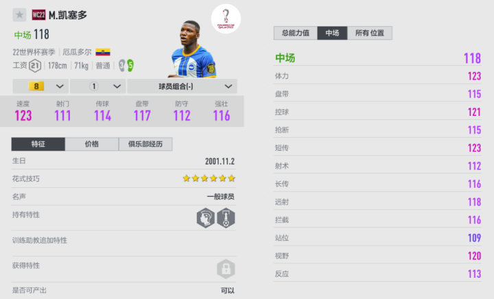凯塞多目前只有WC22赛季还能贴近版本,这张卡是以他在世界杯预选赛的表现制作的。国家队里的凯塞多,不仅要防守,还得参与进攻、传球推进,是中场的绝对核心。所以WC22凯塞多的位置显示是“中场”而非“后腰”。