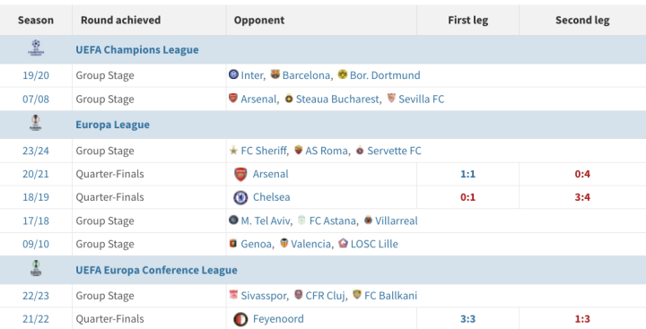 虽然整体欧战战绩不佳,但不乏一些高光时刻,在2018-19赛季,欧联杯淘汰赛中,依靠西蒙·凯尔(Simon Kjaer)的乌龙球,双回合6:5战胜欧联杯之王塞维利亚(Sevilla FC)晋级下一轮。在2019-20赛季的欧冠小组赛与国际米兰(Inter Milan)、多特蒙德(Borussia Dortmund)和巴塞罗那(FC Barcelona)分在同个死亡之组,虽然未尝胜绩,但在两个客场逼平国米和巴萨也创造了历史。在2020-21赛季两回合2:0淘汰莱斯特城(Leicester City)进入下一轮,并在四分之一决赛中首回合1:1战平阿森纳(Arsenal FC)!