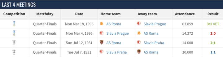 罗马曾4次面对过布拉格斯拉维亚皆是在上个世纪,取得了2胜1平1负(其中1场在加时赛取得胜利)的成绩,前两次交锋就是在1931年的米杜柏杯中,罗马两回合3:2淘汰对手,而后两次则是在1995-96赛季的欧洲联盟杯(UEFA-CUP)中,首回合布拉格斯拉维亚主场2:0战胜罗马,次回合罗马则在主场常规时间2:0逼平比分,进入加时,虽然托蒂在第92分钟助攻弗朗西斯科·莫雷罗(Francesco Moriero)先下一城,但捷克球队在第112分钟吉里·瓦夫拉(Jiri Vavra)打入一球,由于主客场进球优势,罗马被淘汰出局。