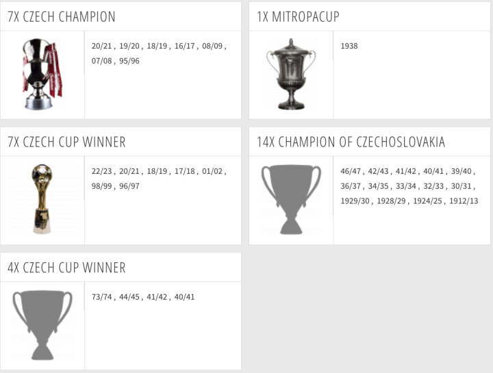 作为捷克足球甲级联赛的老牌,常年与布拉格斯巴达争夺冠军奖杯,但这几年比尔森胜利(FC Viktoria Plzen)也异军突起,加入了争冠的行列,截止现在布拉格斯拉维亚获得了7座捷克足球甲级联赛冠军(Czech Champion)、11座捷克杯冠军(Czech Cup Winner)、14座捷克斯洛伐克足球甲级联赛冠军(Champion of Czechoslovakia)以及1座米杜柏杯冠军(Mitropa Cup,在中欧举办的足球俱乐部际赛事,被认为是第一项跨国之间俱乐部参加的赛事)。