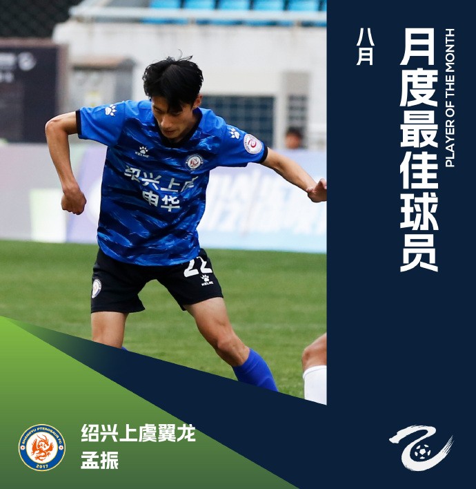 中乙联赛官方宣布,绍兴上虞翼龙孟振以满分当选8月最佳球员。