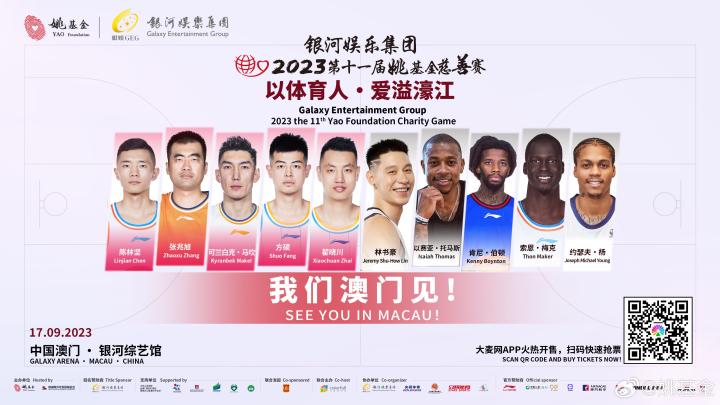姚基金官博写道:“9月17日,中国最具影响力的体育公益赛事将登陆澳门银河综艺馆,由方硕、翟晓川领衔的中国篮球明星队将对阵由林书豪、以赛亚-托马斯领衔的国际篮球明星队,更有众多文体明星重磅加入!现场超乎你想象,来现场为精彩振臂高呼吧!”