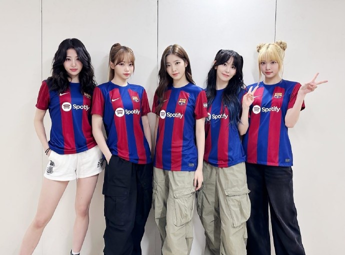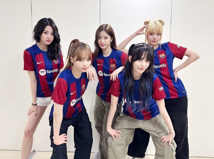 韩国女子演唱组合LE SSERAFIM身穿巴萨球衣