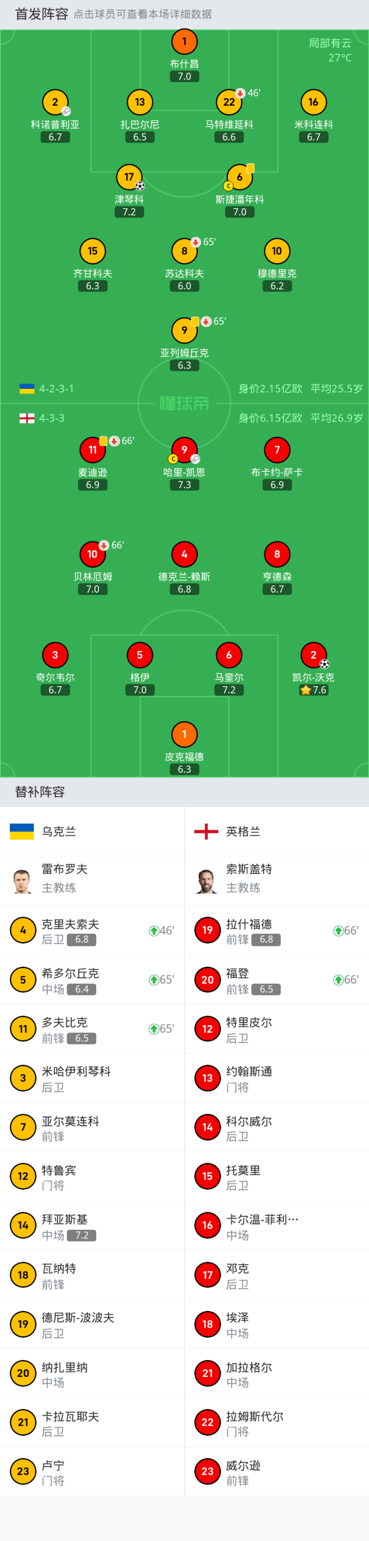 乌克兰首发:6-斯捷潘年科, 1-布什昌, 9-亚列姆丘克, 17-津琴科, 15-齐甘科夫, 22-马特维延科, 16-米科连科, 2-科诺普利亚, 10-穆德里克, 8-苏达科夫, 13-扎巴尔尼