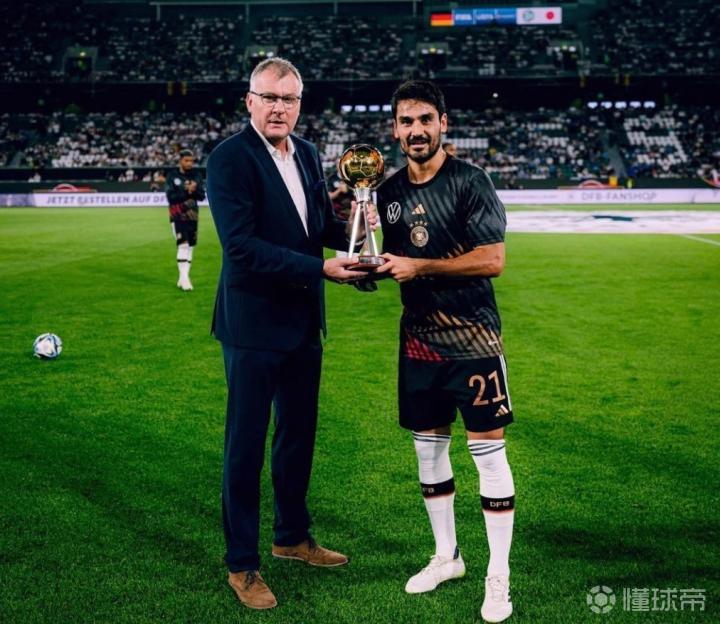 如今在德国与日本的友谊赛开始前,刚刚被任命为德国国家队新任队长的京多安领取了2023年德国足球先生的奖杯。