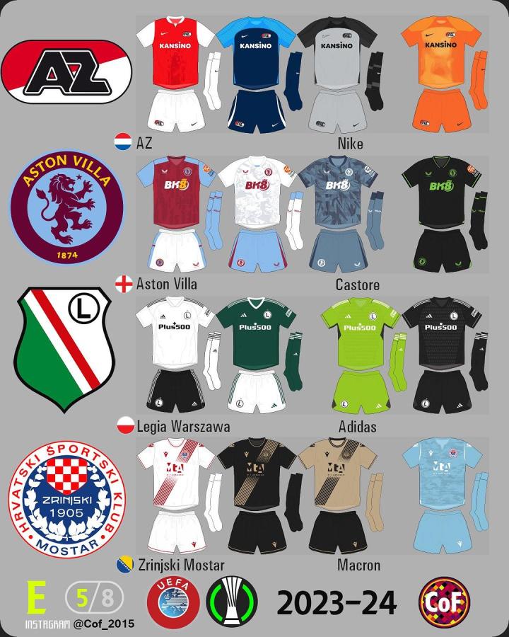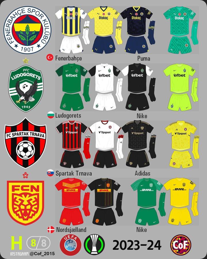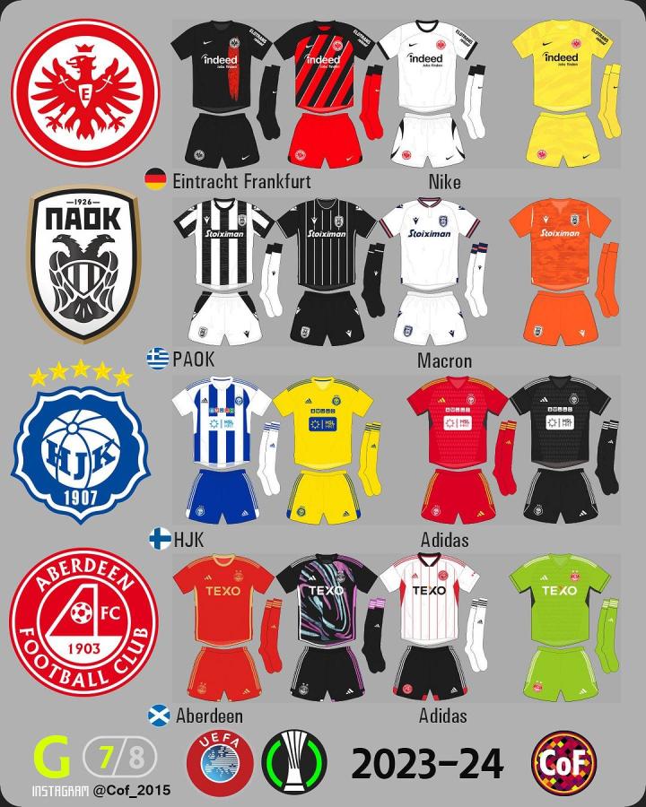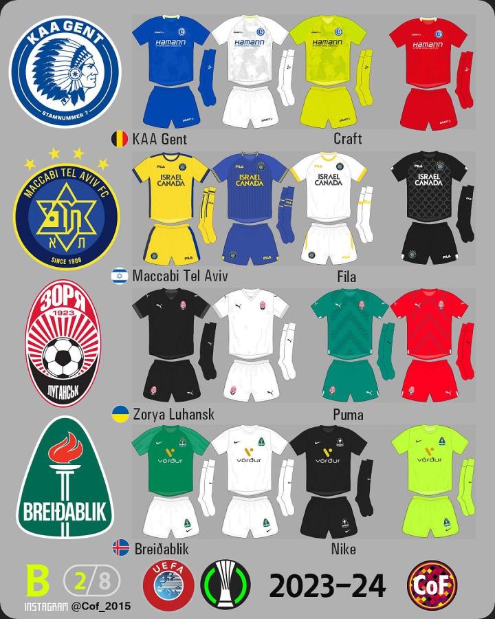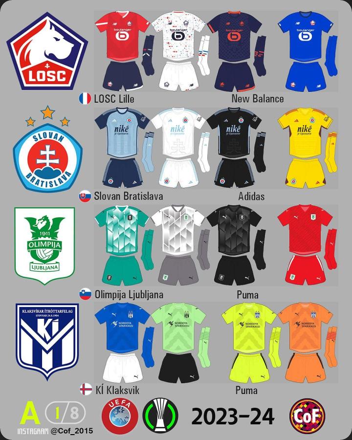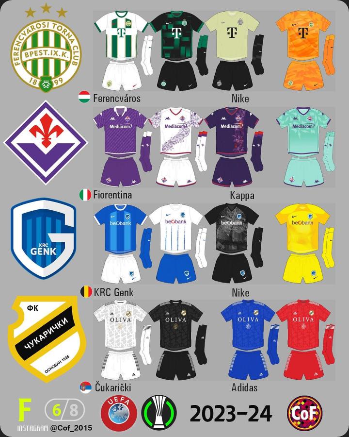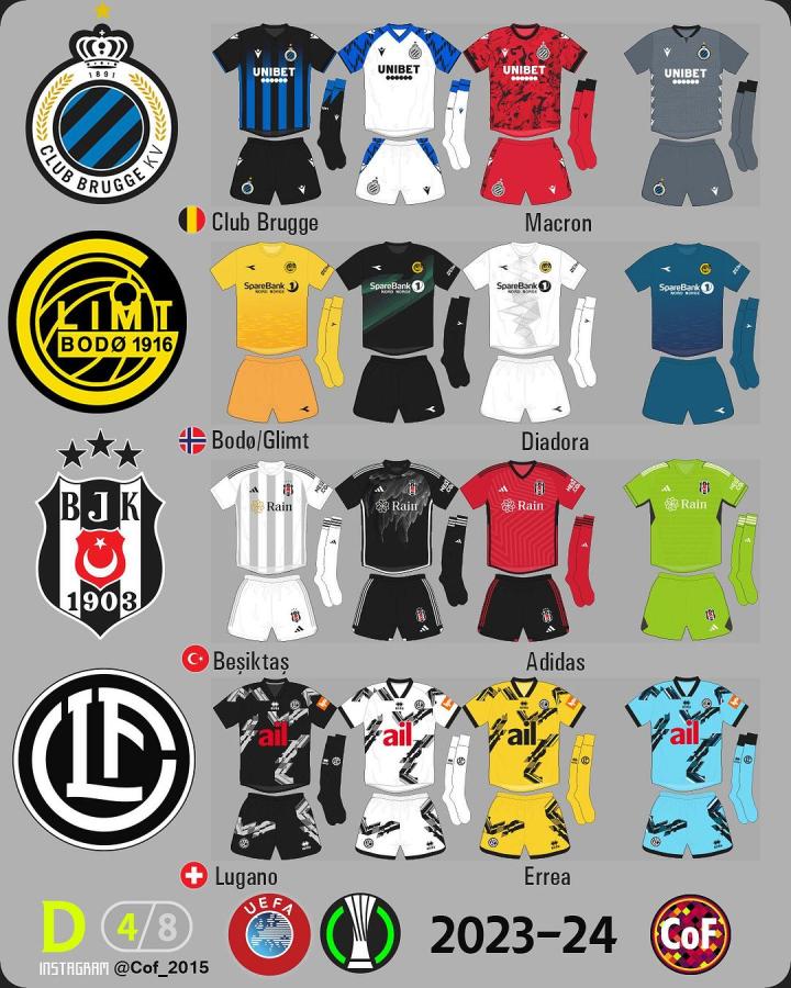 欧协联2023-24赛季各俱乐部球衣一览。