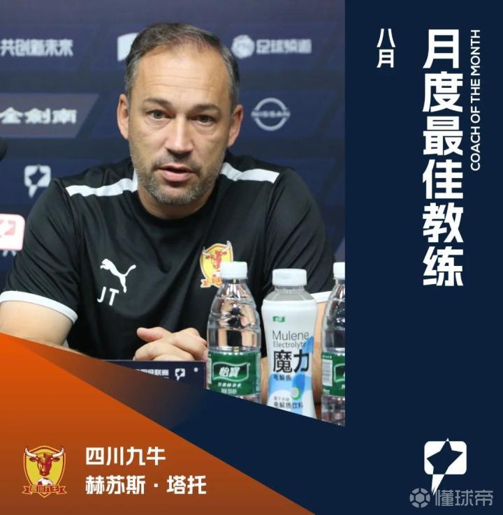 北京时间9月10日,中甲官方宣布,率队在8月联赛中取得4战全胜的四川九牛主帅塔托当选联赛8月最佳教练。
