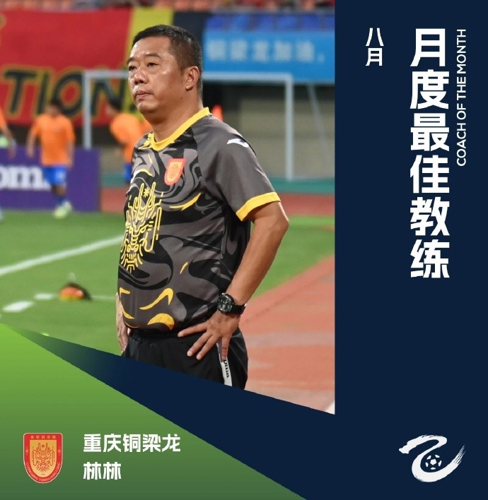 中乙联赛官方宣布,重庆铜梁龙主帅林林当选8月最佳教练。