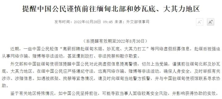 外交部曾发表公告提醒中国公民不要前往缅甸北部和妙瓦底地区