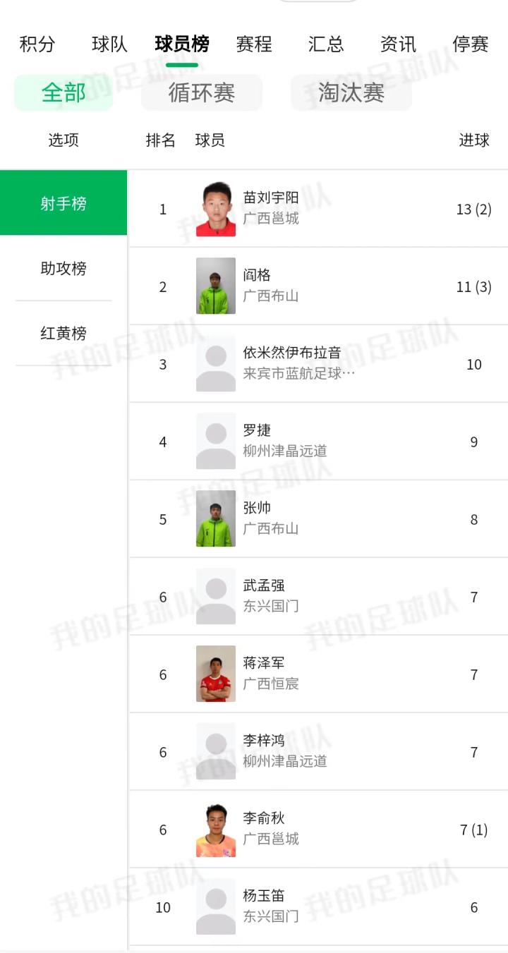 射手榜方面,本轮上演帽子戏法的苗刘宇阳进球数达到13个,超越11球的阎格11球独自领跑射手榜,伊布拉音、罗捷、武孟强、蒋泽军、李梓鸿、张帅、安凯儿.尔肯等人紧随其后。
