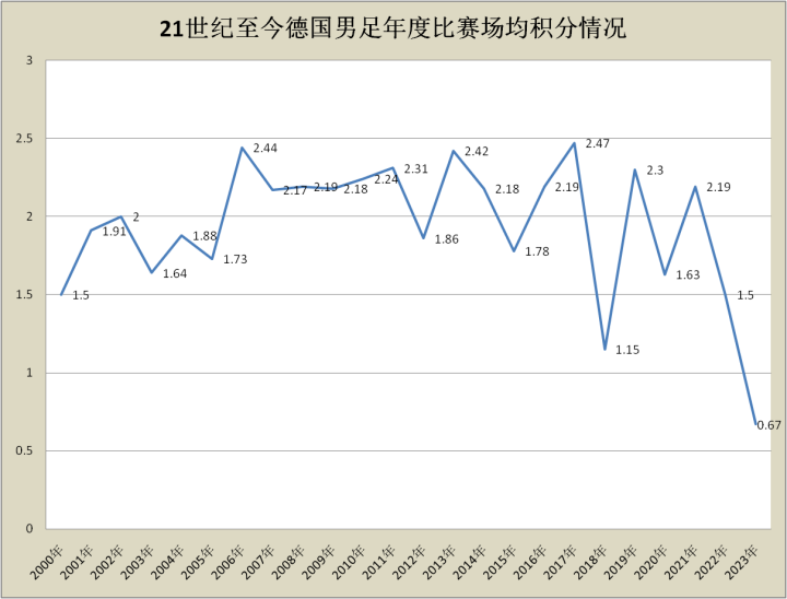 回顾德国国家队历史年度场均比赛积分,德国队在输给日本队之后的本年度场均积分仅0.67分,这个数据不仅是自1956年以来首次低于1分,也追平了德国国家队在1921年创造的最差成绩。