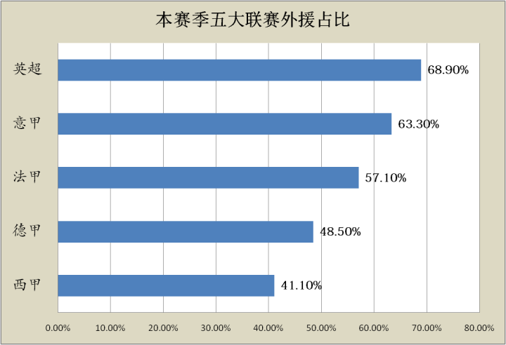 本赛季德甲联赛的外援比例约为48.5%,德甲是本赛季五大联赛中本土球员比例第二高的球队,也只有西甲和德甲的本土球员比例超过50%。