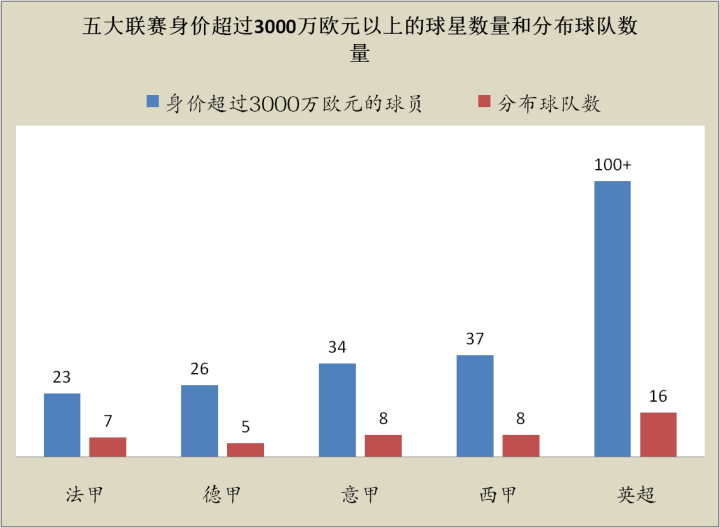德甲在本赛季仅有26名球员的身价高于3000万欧元,在德甲球员人数仅占5%,德甲联赛在两项数据上仅高于法甲联赛位列五大联赛倒数第二。值得注意的是,德甲这26名超级球星仅分布在5支球队,这个数据在五大联赛中垫底,其中更是有10名球员全部效力于拜仁慕尼黑。