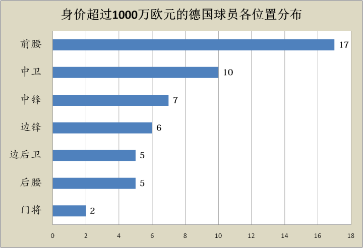 德国球员的竞争力下降已经成为不争的事实,在各个位置上的球星分布中,除了门将之外,分别只有5名德国边后卫和德国后腰的身价高于1000万欧元,此外德国在中锋和边锋位置上也面临着青黄不接的局面。