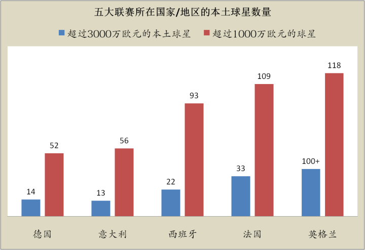 德国本土球星数量在五大联赛所在国家/地区中垫底