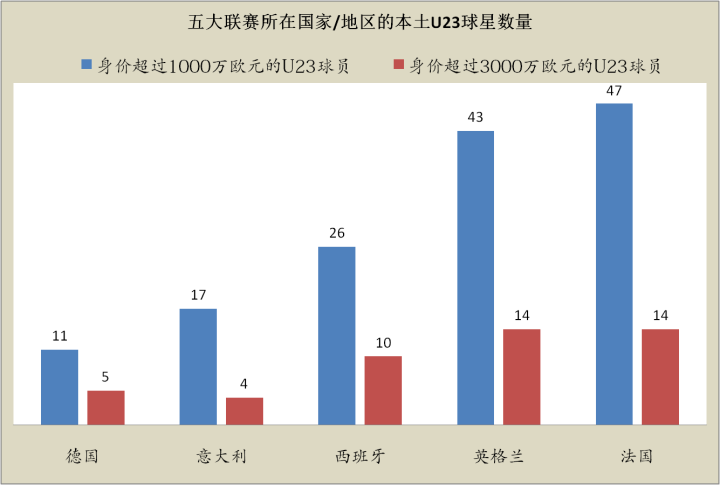 根据德国转会市场的统计,目前只有11名德国23岁以下球员的身价高于1000万欧元,这个数据在五大联赛所在国家/地区中垫底,其中只有5名德国23岁以下球员的身价高于3000万欧元。