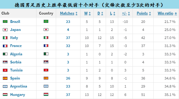 有意思的是,在德国完败给日本队之后,日本队成为了德国国家队历史对手中胜率最高的球队(75%),排名第一的是对阵德国胜率高达78.3%的超级苦主巴西队。