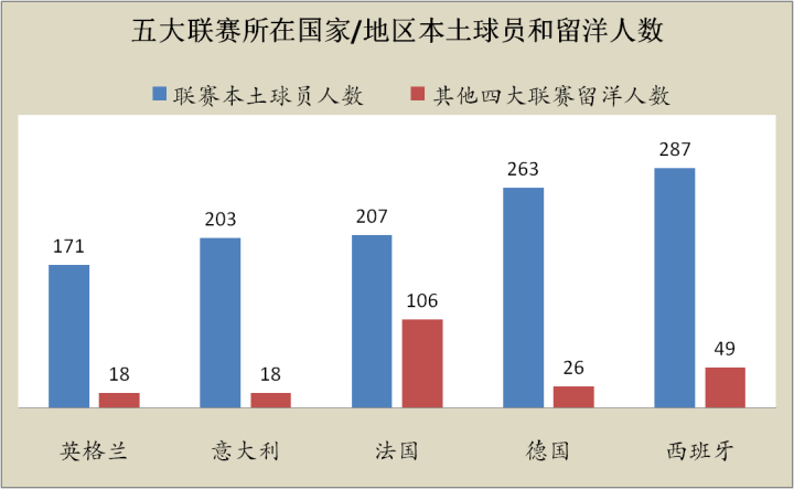 德国球员本赛季仅有26名球员效力于其他四大联赛,与在连续近两届世界杯都能杀进决赛的法国相比,德国在其他四大联赛的留洋球员人数远远低于法国的106人。