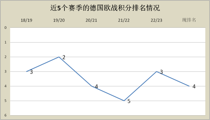 德甲球队在过去的五个赛季的欧战积分呈现下滑趋势,除了19/20赛季的第二名之外再无高光表现,21/22赛季一度跌到第5。