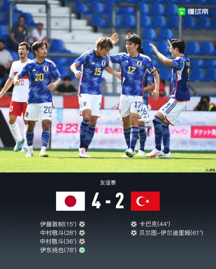 北京时间9月12日友谊赛,日本主场对阵土耳其。上半场日本伊藤敦树破门,中村敬斗梅开二度,下半场伊东纯也点射破门,土耳其卡巴克破门,贝尔图-伊尔迪里姆破门。最终比分4-2。
