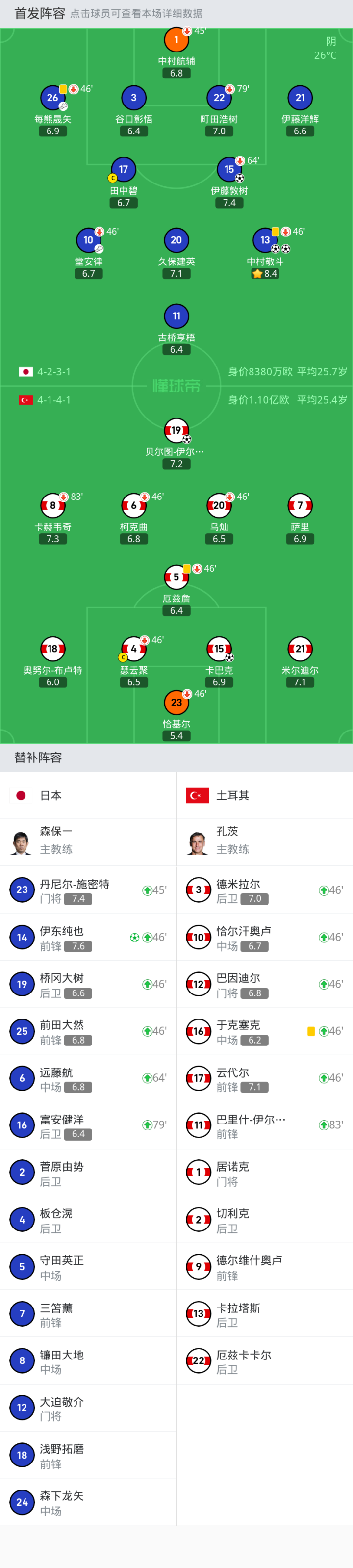 替换下场:46'20-乌灿, 83'8-卡赫韦奇, 46'4-瑟云聚, 46'23-恰基尔, 46'5-厄兹詹, 46'6-柯克曲