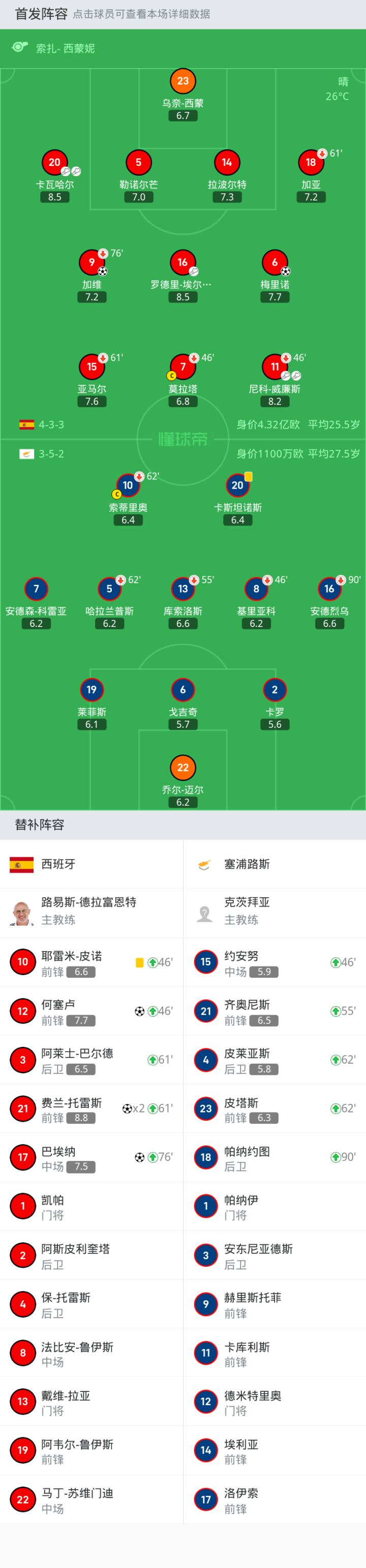 替换下场:46'7-莫拉塔, 61'18-加亚, 46'11-尼科-威廉斯, 76'9-加维, 61'15-亚马尔