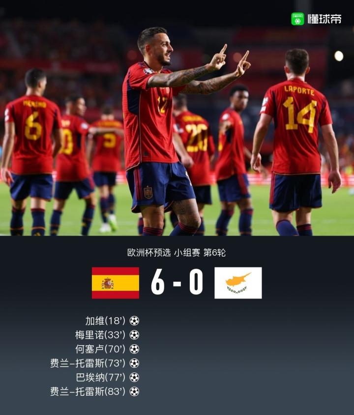 北京时间9月13日欧洲杯预选 小组赛 第6轮,西班牙主场对阵塞浦路斯。上半场西班牙加维破门,梅里诺破门,尼科-威廉斯两度助攻后伤退,莫拉塔越位进球。下半场,何塞卢替补登场一传一射,卡瓦哈尔同样助攻双响,费兰-托雷斯梅开二度,巴埃纳破门。最终比分6-0。