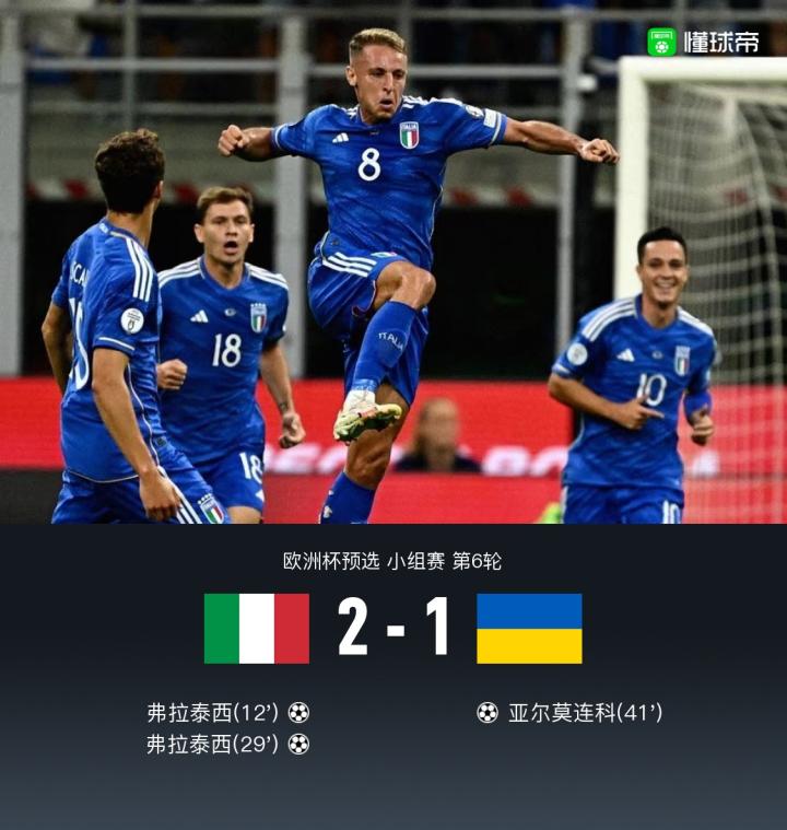 意大利2-1力克乌克兰,弗拉泰西梅开二度,扎卡尼送助攻