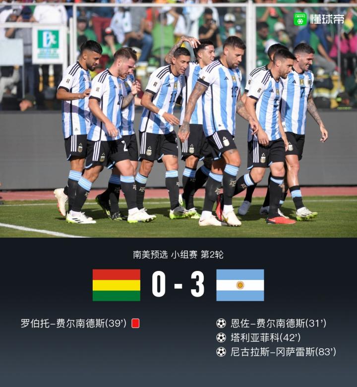 北京时间9月13日南美预选 小组赛 第2轮,玻利维亚主场对阵阿根廷。上半场,阿根廷恩佐-费尔南德斯破门,塔利亚菲科破门,迪马利亚助攻双响,罗伯托-费尔南德斯踩踏罗梅罗被直红罚下。下半场,帕拉西奥斯替补登场助攻尼古拉斯-冈萨雷斯破门。最终比分0-3。
