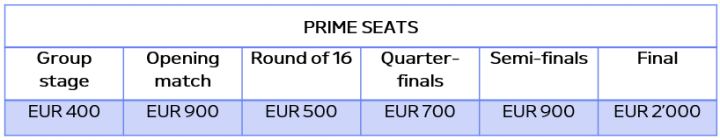 Fans First球票位置在球门后,三等票位置在角球区和球门后,二等票位置在角球区,球门后和长边看台,一等票位置在长边看台和角球区,特等票位置在一等票位置的中间,特等票在第一阶段不发售。