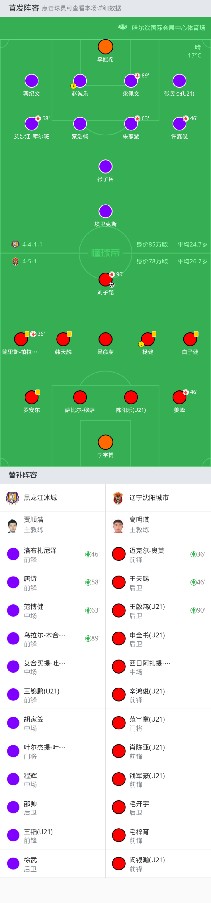 替换下场:90'+27-刘子铭, 36'18-鲍里斯-帕拉西奥斯, 46'31-姜峰