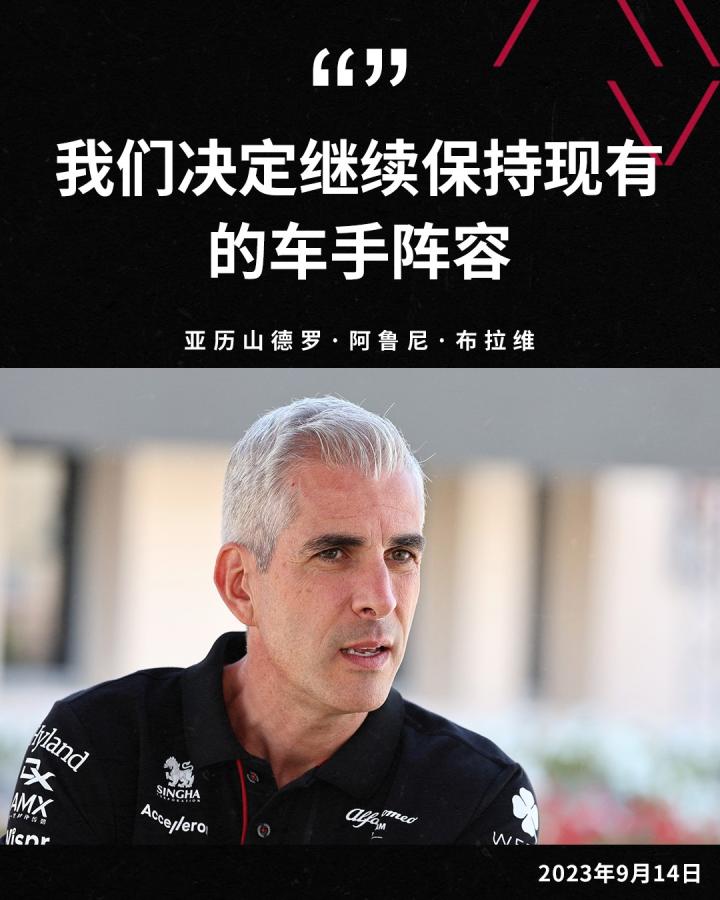 我们决定继续保持现有的车手阵容,这也是我们前进征途中所付出努力的证明。罗马非一日建成,F1的世界也是如此。我们主动寻求保持稳定性,在这一承上启下的关键时期继续建设我们的团队。博塔斯和周冠宇都是才华横溢、技术精湛的车手,他们合作愉快,配合默契,能够相互鼓励推进。博塔斯在车队中扮演着领导者的角色,推动大家全力以赴;周冠宇在过去两年中取得了令人印象深刻的进步,我们期待他在2024年再创佳绩。现在,接力棒又回到了我们手中,我们必须为两位车手提供一辆优秀的赛车,为他们创造最佳环境去展现自我。最后,我很高兴波谢尔将作为我们的后备车手之一在2024赛季继续留队,他今年的表现令人印象深刻,我们支持他在阿布扎比的F2收官战中争夺冠军,此外在幕后他还与欣维尔团队一起完成工作。