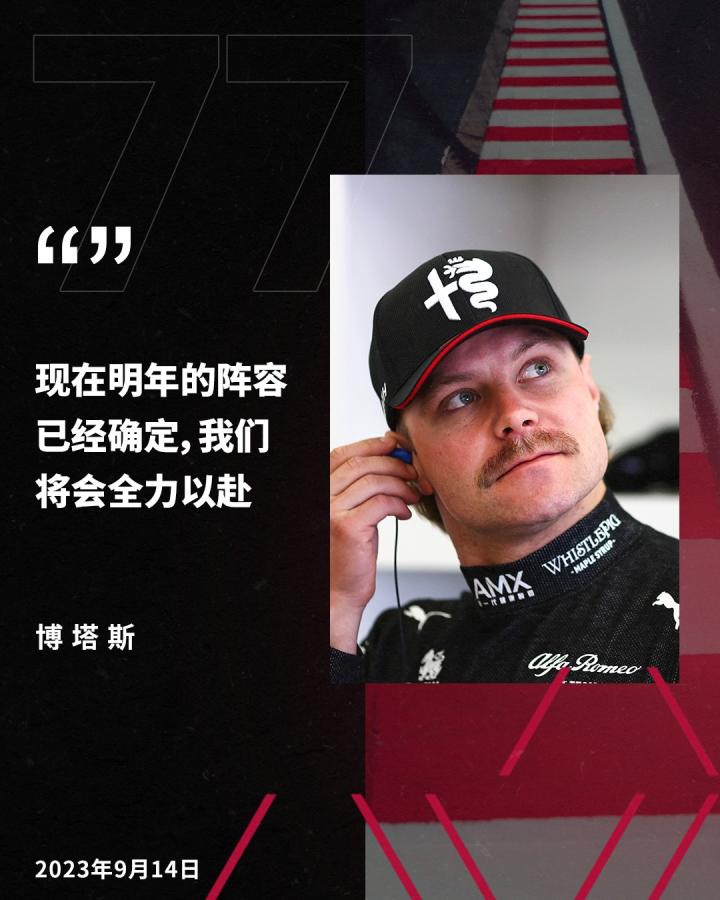 北京时间2023年9月14日,F1阿尔法罗密欧车队官方宣布,2024年车队阵容保持不变,依然是由中国车手周冠宇搭档芬兰车手博塔斯出战,这也意味着周冠宇的合同至少续约到2024年。值得一提的是,明年4月19日至21日,F1中国大奖赛上海站将时隔5年重新回归,届时周冠宇也将首次在主场作战。