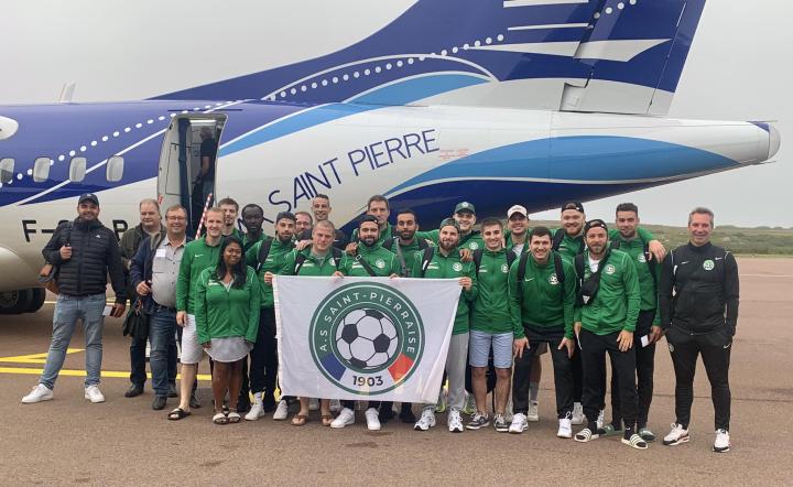 2023年9月11日, 圣皮埃尔和密克隆, 圣皮埃尔布兰奇角机场, 穿着绿色衣装的人群正等待着下一班航班。这些人是当地足球队圣皮埃尔体育会(ASSP)的球员和教练组, 他们每个人的脸上都洋溢着笑容, 因为这支绰号"绿军"的队伍即将前往法国足球的圣地——克莱枫丹, 并接着前往布列塔尼半岛, 参加世界上规模最大的足球赛事——法国杯足球赛。