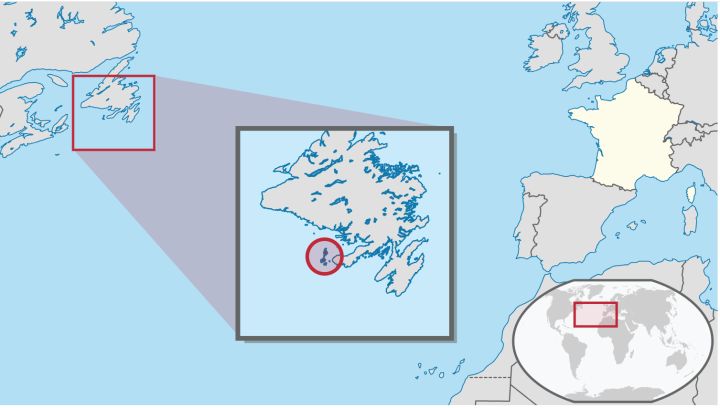 圣皮埃尔和密克隆, 位于北大西洋上, 是法国在北美洲的海外集体属地(Collectivité d'outre-mer, COM), 其中最主要的岛屿是圣皮埃尔岛和密克隆岛等, 它是前法国殖民地新法兰西中仅存的依然由法国统治的地区。