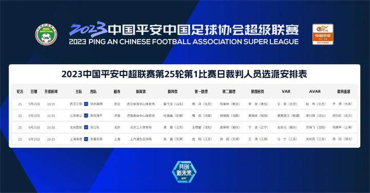 9月15日19:35,2023赛季中超联赛第25轮先赛4场。当天上午,中超官方公布了这4场比赛的裁判人员选派安排表。