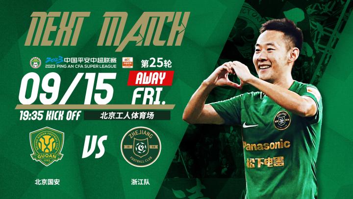 北京国安将在北京工人体育场,与浙江队上演“双绿会”(两队战袍都是绿色)。来自江苏的主裁判黄翼,将主哨此役;第一助理是来自沈阳的王德馨,第二助理是来自重庆的唐荣地;第四官员是来自辽宁的于波;视频助理裁判是来自重庆的国际级裁判员金京元,助理视频助理裁判是来自沈阳的苏晓飞;裁判监督是来自上海的陆建平。