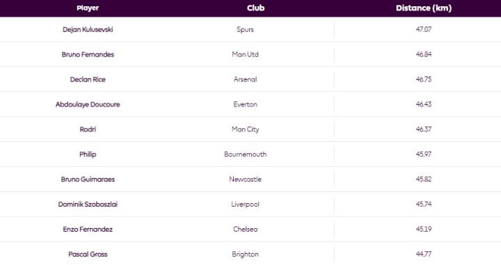 2023-24赛季英超联赛前4轮球员总跑动距离榜(前10位)