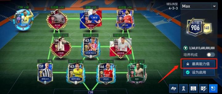 【注】在球队阵容界面,点击右侧的“最高能力值”,系统会自动派出自己最高能力值的球员登场。玩家可以点击“最高能力值”后,对阵容再进行微调,减少配置阵容时间